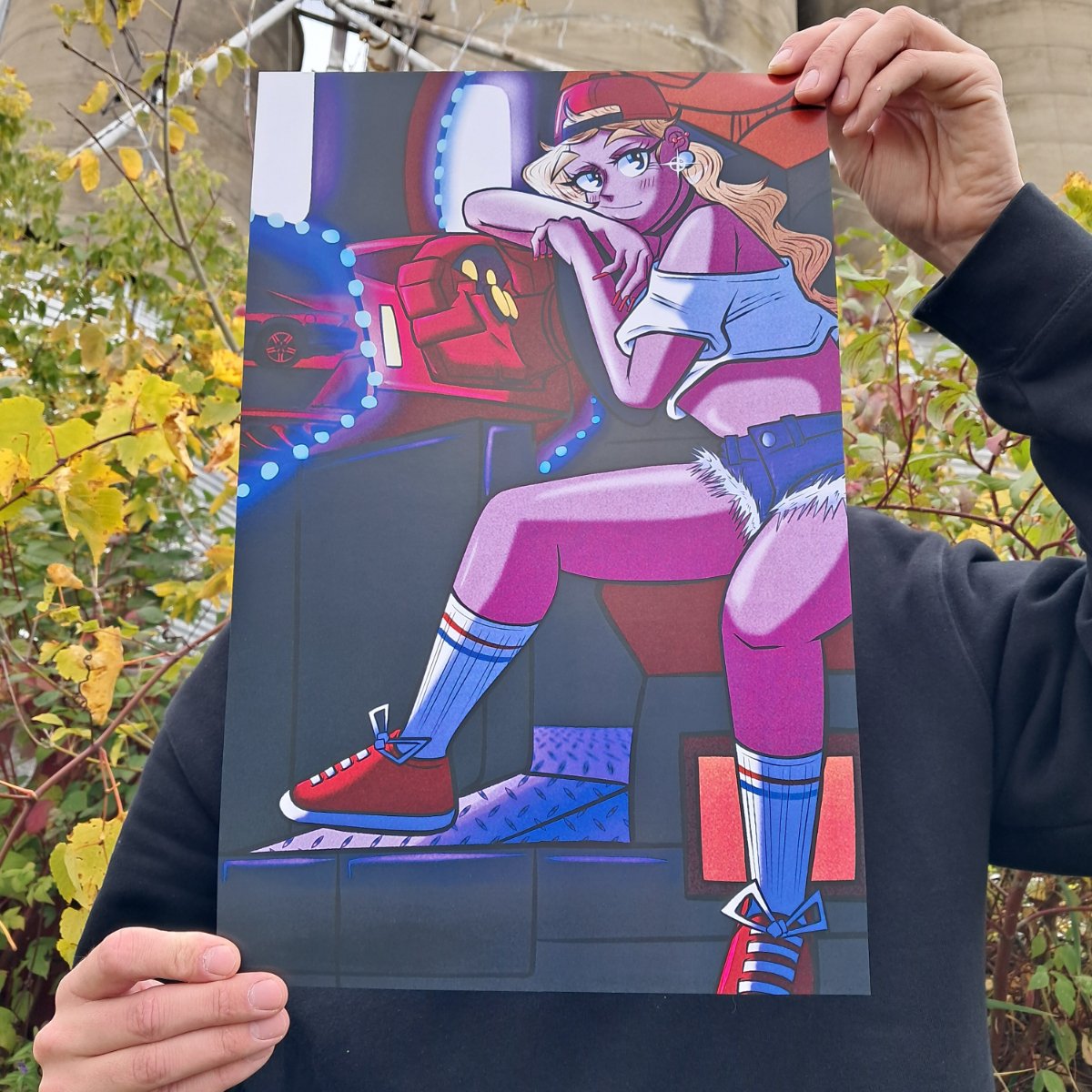 Cami; a gijinka girl based on my 2000 Chevy Camaro ready to play an arcade racing game.