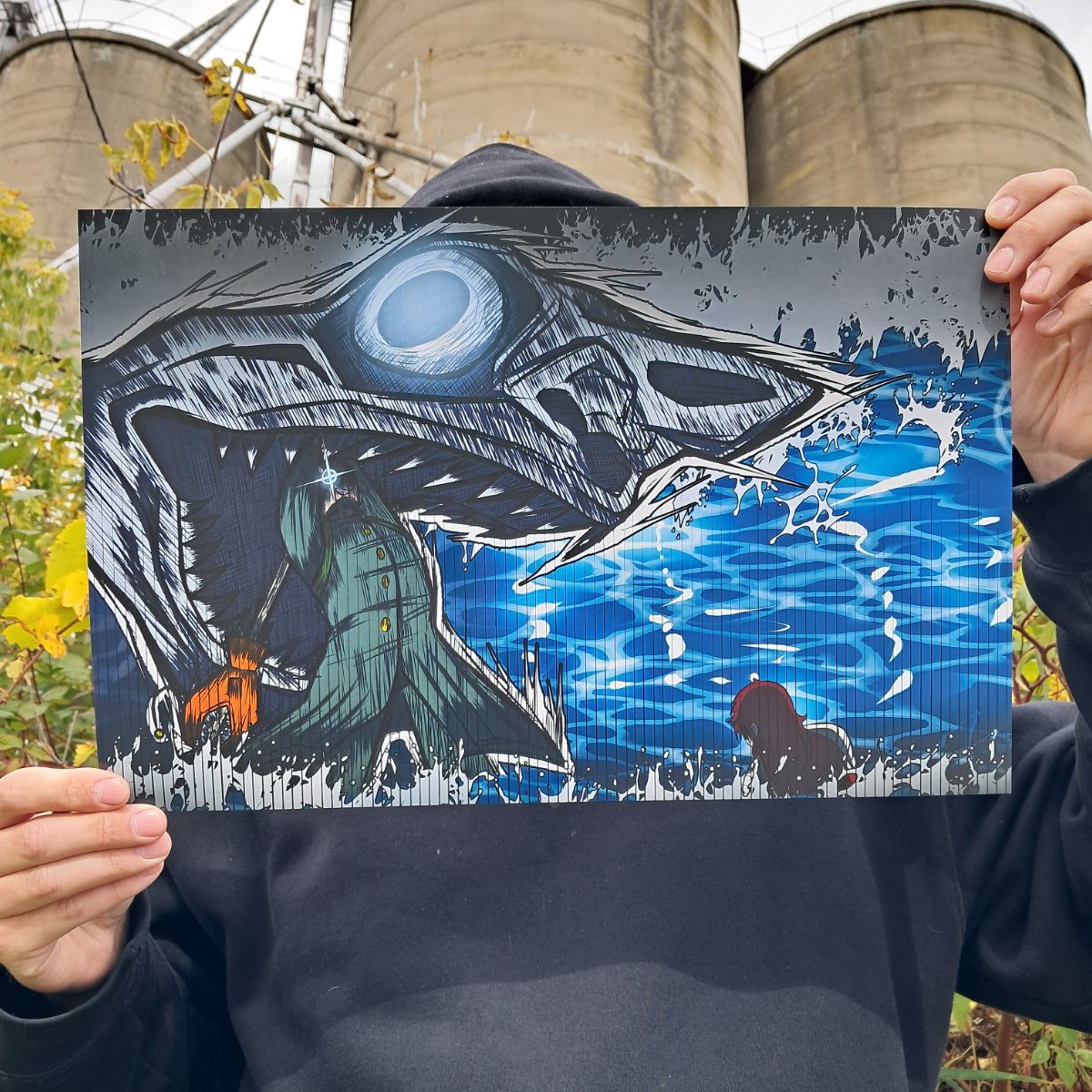 Glossy light card stock print carefully packaged in a protective sleeve with cardboard backing for rigidity. 11"x17"