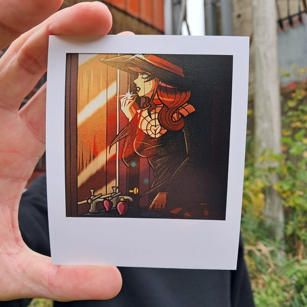 Glossy light card stock polaroid style print carefully packaged in a protective sleeve with cardboard backing for rigidity. 3.5" x 4.25"